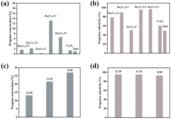 We evaluated propane dehydrogenation performance of Zn1Cr2–CO32−–MMO and ZnCr–CrO42−–MMO with different Zn/Cr ratios. The performance of all the catalysts for the PDH reaction was evaluated at 550 °C, 0.1 MPa, C3H8:N2 = 1:4.32, and WHSV = 22.3 h−1. Figure 4a,b display the initial conversion and selectivity of various catalysts (Initial conversion and selectivity here refer to data collected 7 min after propane is fed). It is clear that the PDH performance of the catalyst using chromate–intercalated hydroxides as precursors (Zn1Cr2–CrO42−–MMO) is superior to that of the catalyst with non–intercalated hydroxides as precursors (Zn1Cr2–CO32−–MMO) for Zn/Cr=1:2. The Zn1Cr2–CO32−–MMO were primarily composed of the ZnCr2O4 spinel phase and the crystalline ZnO phase (Figure 3a). Due to the fact that dispersed and unsaturated Cr3+ is typically regarded as the active site for propane dehydrogenation, Cr is inactive against propane when it enters the spinel phase [28]. Additionally, the propane conversion on crystalline ZnO is low and unstable under reaction conditions [22]. As a result, Zn1Cr2–CO32−–MMO exhibited low PDH activity, with less than 2% propane conversion. Furthermore, the PDH performance exhibited an increase with the rise in Cr ratio in catalysts with various Zn/Cr ratios. The propane conversion rate was highest (13%) when the Zn/Cr ratio was 1:2 (Zn1Cr3–CrO42−–MMO), and decreased to 6.5% with further increase in the Cr ratio. This could be attributed to the fact that as the amount of chromium increases, the Zn1Cr3–CrO42−–MMO exhibited crystalline Cr2O3 (Figure S4). Previous studies have shown that the activity of alkane dehydrogenation decreases when the accompanied by the formation of crystalline Cr [29], which was the reason for the reduced PDH conversion performance of the Zn1Cr3–CrO42−–MMO catalysts. Accordingly, it is presumed that the chromate is reduced during the reaction to reactive Cr3+, which has a positive effect on the reaction.