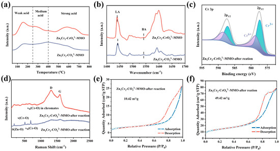 The Raman spectra show a weakening of the intensity of the Cr–O vibrational peaks belonging to chromate in the catalysts after reaction (Figure 5d), consistent with the XPS results. This further proves that Cr6+ is reduced to Cr3+ under the reaction conditions, and that Cr3+ may function as an active site. Furthermore, the Raman spectra of the Zn1Cr2–CrO42−–MMO catalyst exhibit clear defects (D) and graphitization (G) peaks at approximately 1500 cm−1 [39], indicating the presence of carbon deposits on the catalyst. The weak peaks of carbon in the Raman spectrum of Zn1Cr2–CO32−–MMO may be attributed to its low conversion ratio (<2%), which makes the amount of carbon deposits low.