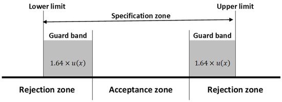 A robust and updated approach to solve this issue is the use of guard bands (g) [33] that define rejection zones from delineated as specification limit L plus a value g (1.64 × standard uncertainty for a significance level of 5%). This statistical methodology can be very useful when there is/are partial overlap(s) between the measurement uncertainty and the lower and upper acceptance limits, Figure 1.
