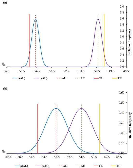 Carbon isotopic analysis of methane conformity assessment with an expanded uncertainty of (a) 0.5‰ and (b) 1.8‰. p(AL)—probability density at the lower acceptance limit; p(AU)—probability density at the upper acceptance limit; AL—lower acceptance limit; AU—upper acceptance limit; TL—lower tolerance limit and TU—upper tolerance limit.