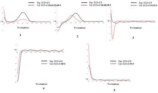 In general, conformational analyses were carried out via random searching in the Sybyl-X 2.0 using the MMFF94S force field with an energy cutoff of 5 kcal/mol [24]. The results showed the six lowest energy conformers. Subsequently, geometry optimizations and frequency analyses were implemented at the B3LYP/6-31G (d)level in CPCM methanol using ORCA5.0.1. All conformers used for property calculations in this work were characterized to be stable points on potential energy surfaces (PES) with no imaginary frequencies. The excitation energies, oscillator strengths, and rotational strengths (velocity) of the first 60 excited states were calculated using the TD-DFT methodology at the PBE0/def2-TZVP level in CPCM methanol using ORCA5.0.1 [25]. The ECD spectra were simulated by the overlapping Gaussian function (half the bandwidth at 1/e peak height, sigma = 0.30 for all) [26]. Gibbs free energies for conformers were determined by using thermal correction at the B3LYP/6-311G(d,p) level and electronic energies evaluated at the wB97M-V/def2-TZVP level in CPCM methanol using ORCA5.0.1. To obtain the final spectra, the simulated spectra of the conformers were averaged according to the Boltzmann distribution theory and their relative Gibbs free energy (∆G). By comparing the experiment spectra with the calculated model molecules, the absolute configuration of the only chiral center was determined. Finally, by comparing the experimental ECD spectra of compounds 1–5 with the spectra calculated for the proposed structures using quantum chemical TDDFT, the absolute configurations of the compounds were determined. When the predicted ECD spectra were in good agreement with the experimental spectra, showing similar negative Cotton effects, the absolute configurations were established.