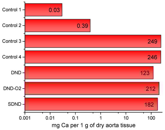 The allograft was calcined to a similar degree, as outlined in Table 3. It was observed that the nanodiamond-containing coating did not increase calcium growth on the surface of the aorta. The presence of iron in these samples can be considered as a typical admixture in detonation nanodiamonds [49].