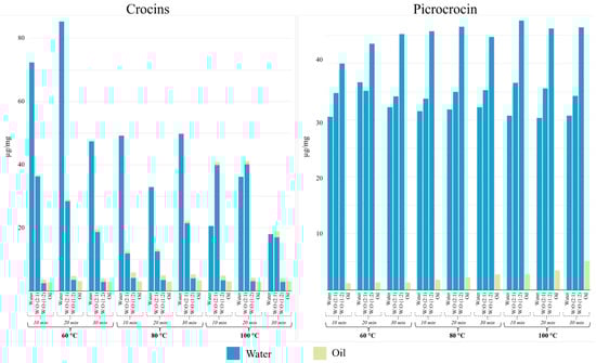 Saffron is mainly used in the agro-food industry due to its organoleptic properties related to its coloring and flavoring properties. The main compounds responsible for these properties are crocins, safranal, and picrocrocin, responsible for saffron’s color, aroma, and bitter taste, respectively [27]. Although spices have traditionally been used for food preparations to improve flavor and taste, they are also often used as antioxidant food supplements. The antioxidant activity of saffron is mainly explained by the presence of crocin and crocetin, and the synergistic effect of all bioactive constituents [28,29]. Therefore, this study aimed to define the transfer of the mentioned bioactive compounds to the liquid phases (water or oil) by simulating cooking conditions with temperatures between 60 and 100 °C and infusion times of 10, 20, and 30 min.