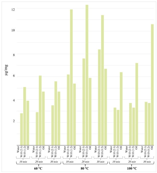 The case of picrocrocin differs from that of crocins since the former was clearly detected at higher concentrations using 1:2 (v/v) water/oil as a medium. In addition, temperature favored the accumulation of picrocrocin. Figure 1 shows that picrocrocin is easily extracted and, practically, there are virtually no significant differences (p-value > 0.05) associated with temperature. Thus, 100 °C was required to reach the maximum concentration in 10 min, 47.6 µg/mg, while similar concentrations were obtained at 60 and 80 °C. The variable with the greatest incidence of picrocrocin isolation seems to be the concentration of water since water/oil compositions reported higher concentrations of picrocrocin than water. Therefore, picrocrocin is efficiently transferred to the aqueous medium and the extraction efficiency did not depend on the volume of water as the extraction equilibrium is quickly reached. When the extractant is 100% oil, we observed that the concentration in this medium increased with increasing temperature and extraction time. However, the maximum concentration of picrocrocin in oil was 5.13 µg/mg at 100 °C in 30 min.