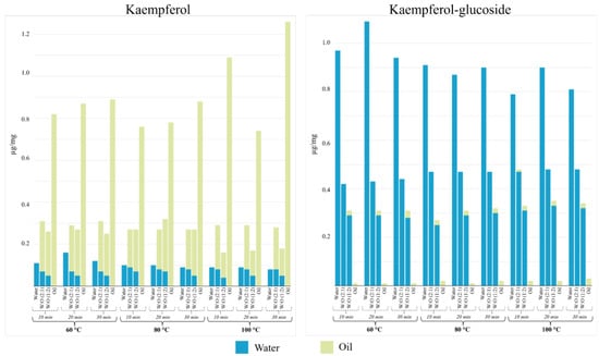 Flavonols are a family of compounds belonging to the large group of flavonoids. Aglycone forms of kaempferol and quercetin, as well as some glycosylated derivatives of them, were detected in the extracts obtained from saffron. In particular, when comparing experimental situations, di- and triglucoside derivatives were found in high concentrations with significant differences (p-value < 0.05). Kaempferol was mostly extracted in 100% oil, with variable behavior when time and temperature were modified (Figure 3 and Figure S4); the maximum concentration of kaempferol (1.26 μg/mg) was obtained at 100 °C and 30 min of extraction.