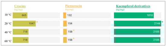 Concentration of crocins, picrocrocin, and kaempferol derivatives (ng/mg) in infusions prepared at temperature from 10 to 60 °C. The asterisk indicates significant differences among infusion temperatures (p < 0.05).