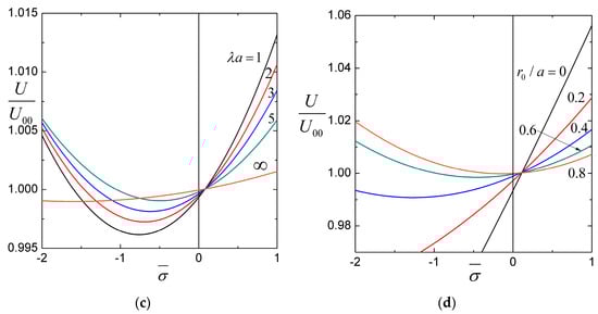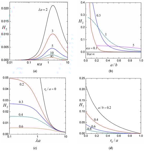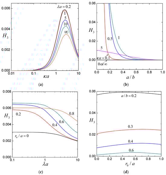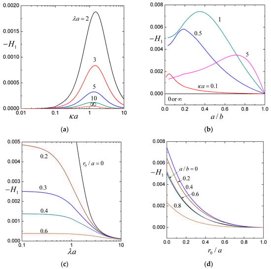 For provided values of , , and , as shown in Figure 2c,d and Figure 3c,d, the coefficients and decrease monotonically and substantially with an increase in the core-to-particle radius ratio (i.e., a decrease in the relative volume, and thus total space charge, of the porous surface layer of the soft sphere), as expected. On the other hand, as shown in Figure 4c,d, the coefficient , due to the surface charge of the cavity wall (it has little to do with the space charge of the porous surface layer), can be a relatively weak nonmonotonic function of . It is understood that, as increases, both and , provided by Equations (23) and (25c), decrease due to the effects of viscous retardation and mainly electroosmotic recirculation, respectively, of the cavity wall on the moving soft sphere. Compared to , decreases slower for low values of and faster for high values of , causing to reach a maximum according to Equation (27c).
