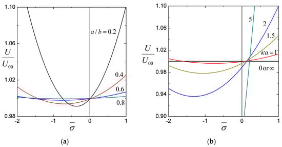 Our results in Figure 2, Figure 3 and Figure 4 show that the coefficient in Equation (26) is an order of magnitude larger than the other coefficients and . Consequently, for a charged soft spherical particle migrating inside a spherical cavity with a surface charge of the same sign (), the net effect of these coefficients is generally an increase of the sedimentation velocity of the particle (with exceptions occurring as is much smaller than in magnitude). For the case of the cavity with a surface charge of the opposite sign (), if is sufficiently larger/smaller than , the net effect is to enhance/reduce the settling velocity. This trend is manifested in Figure 5, which is a plot of the normalized particle velocity of a soft spherical particle with a space charge density in its porous surface layer inside a spherical cavity full of an aqueous solution of potassium chloride calculated using Equation (26) versus the surface charge density of the cavity wall. The enhancement and reduction of the particle velocity caused by the cavity wall can be substantial if is relatively large, especially in cases of small core-to-particle radius ratio , ratio of particle radius-to-porous-layer-permeation length , and particle-to-cavity radius ratio , with moderate values of the ratio of the particle radius to Debye length .