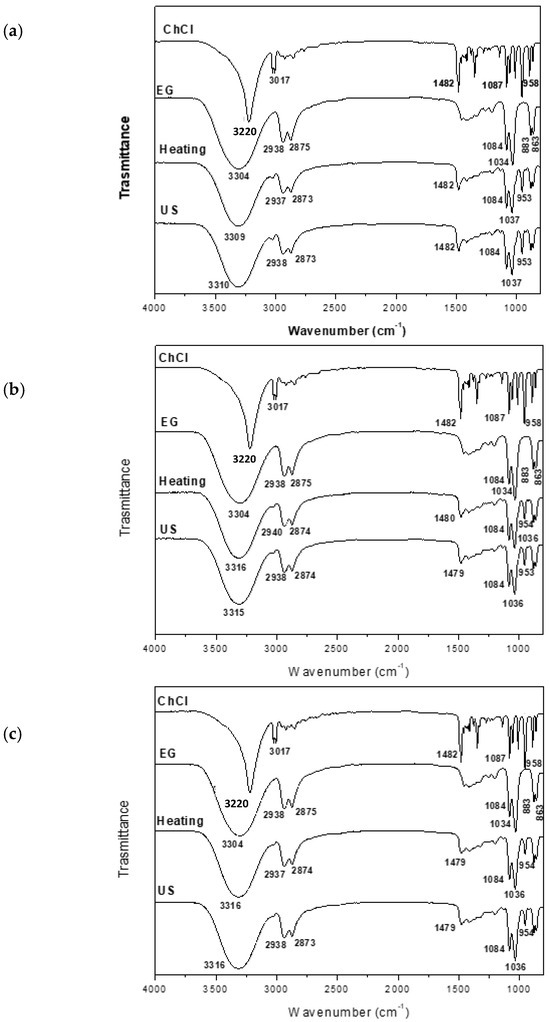 Figure 2 shows the FTIR spectra obtained for ChCl:EG DESs synthesized from different ratios: (1:2) (a), (1:3) (b) and (1:4) (c). Again, the FTIRs obtained for these DESs synthesized via the heating–stirring or ultrasound methods are similar. In all of them, the formation of the DESs is associated with the observed shift in the νas OH signal from 3304 cm−1 in EG to the range of 3316–3309 cm−1 in the synthesized DESs. This shifting is due to a loss of the crystalline structure associated with the formation of H-bonds [31,32,33,34]. The signal assigned to the νsm of the OH of ChCl (3220 cm−1) disappears in the DESs. In all the ChCl:EG DESs, similar signals to those of the starting compounds are observed, regardless of the ChCl:EG ratio used. Therefore, the bands at 2938 cm−1 and 2875 cm−1 correspond to the νas and νs of the C–H, and the signals at 1084 and 1037 cm−1 correspond to the νas and νs of the C–O, as well as those at 883 and 863 cm−1 assigned to ρ CH2 and ν C–C [35,36]. Again, the signals around 1482 cm−1 and 958 cm−1, assigned above to the C–N bond and the νCCO of ChCl, respectively, indicate that the ChCl structure has not changed in the formation of the DESs. No changes are observed in the spectra with an increasing EG ratio.