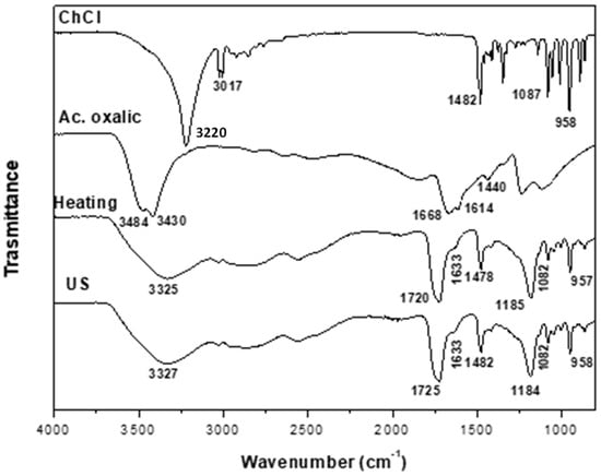 Figure 3 shows the FTIR spectrum obtained for ChCl:oxalic acid (ChCl:Ox 1:1). The spectrum of oxalic acid shows broad overlapping bands centered at 3450 cm−1 in the –OH stretching region typical of carboxylic acid forming dimer rings strongly linked through intermolecular H-bonds and H-bonds between the C=O and O–H groups. It presents a band between 1668 and 1614 cm−1 assigned to the C=O stretching frequency; its splitting is interpreted by the coupling of slightly different C=O groups [37]. Around 1440 cm−1, a signal assigned to C–O stretching appears. These last two signals can be used to recognize the presence of free acid in the synthesized DESs [28]. The DESs obtained using heating–stirring as well as ultrasound methods show similar FTIR spectra. These correspond to a combination of the spectra of the starting compounds with a shift in certain signals. A broadening and shifting to lower wavenumbers of the signal assigned to the OH stretching are observed around 3325 cm−1; the band assigned to the OH group of ChCl at 3220 cm−1 disappears. Signals at 1720 cm−1 indicate the presence of free carbonyl groups (COOH), and the signal at 1633 cm−1 indicates the presence of dissolved Ox [28]. As in the previous DESs, the bands at 1482 cm−1 and 958 cm−1 are assigned to the C–N bond and the νCCO of ChCl, respectively, and the bands at 1184 and 1084 cm−1 correspond to the νas and νs of the C–O [28,30,38].
