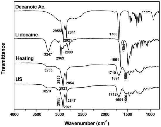 FTIR spectra of Decanoic ac, lidocaine and Lid:Ac. Dec (1:2) DESs obtained using the heating–stirring and ultrasound methods.