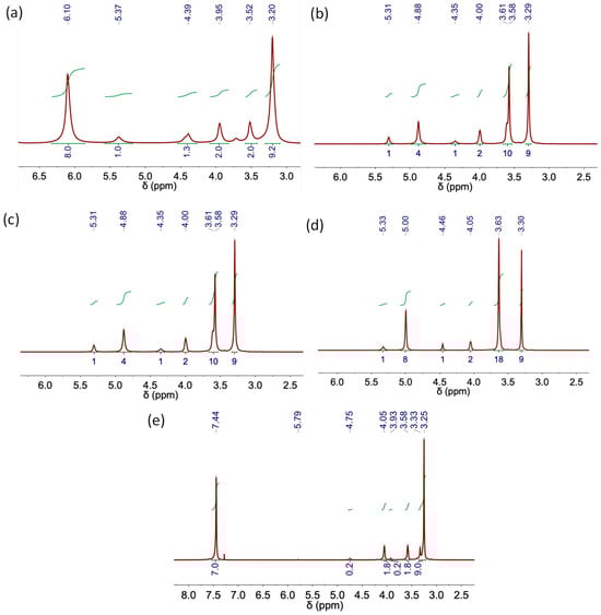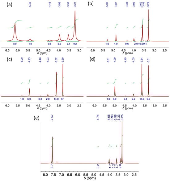 NMR spectrum of DES obtained using the heating–stirring method. (a) ChCl-Urea (1:2), (b) ChCl:EG (1:2), (c) ChCl:EG (1:3), (d) ChCl:EG (1:4) and (e) ChCl:Ox (1:1).