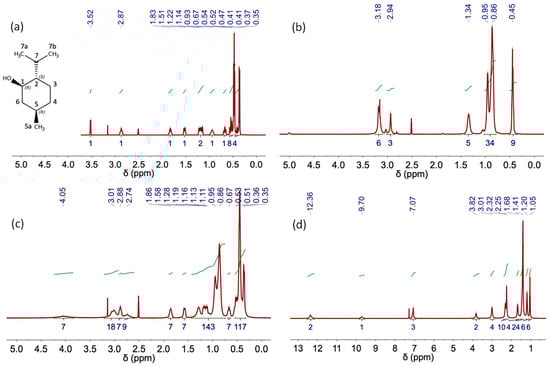 NMR spectra of (a) L-Menthol, (b) Aliquat 336 TG, (c) Aliq:L Met (3:7) and (d) Lid:Ac. Dec (1:2) DES obtained using the heating–stirring method.