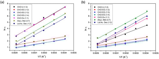 Plots of ln viscosity vs. inverse of temperature for different DESs synthesized using the two methods studied: (a) heating–stirring method, (b) ultrasonic-assisted synthesis.