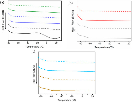 DSC curves obtained from the studied DESs synthesized via heating–stirring (solid lines) and ultrasound (dashed lines) methods. (a) ChCl:EG (1:2) (black), ChCl:EG (1:3) (purple), ChCl:EG (1:4) (green); (b) ChCl:U (1:2), (gray), ChCl:Ox (red); and (c) Aliq:L Met (3:7) (light blue), Lid:Ac. Dec (1:2) (brown).