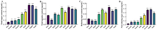 Reducing sugars mainly include glucose, fructose, galactose, and maltose. After repeated heat treatment, ginsenosides are hydrolyzed to glycosides and sugars [25]. Non-reducing sugars mainly include starch, sucrose, and arabinogalactan. SGW was continuously reduced and concentrated by repeated rounds of heating [26]. Thermal processing leads to a decrease in the amount of water-soluble polysaccharides and an increase in the amount of acidic polysaccharides [27]. Starch was the main component of ginseng polysaccharides that were extracted from ginseng roots. During repeated heating and steaming processes, ginseng starch was pasted to form monosaccharides or oligosaccharides. The viscosity of ginseng starch gradually increased after the seventh and eighth steaming cycle [28].