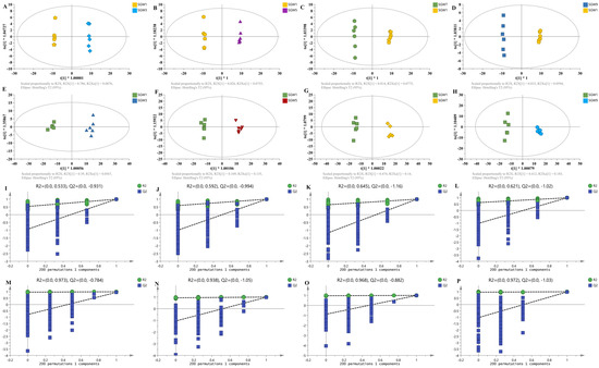 Multivariate statistical analysis base on components from steaming ginseng water with 1-,3-,5-,7-,9-SGW. (A–D) OPLS-DA score plots in the (−) negative ion mode. (E–H) OPLS-DA score plots in the (+) positive ion mode. (I–L) Permutation test in the (−) negative ion mode. (M–P) Permutation test in the (+) positive ion mode.