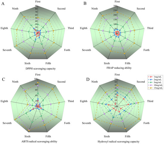 The free radical scavenging capacity was evaluated according to the IC50 value and the scavenging percentage (the IC50 value is defined as the concentration of the antioxidant that is needed to scavenge 50% of the free radicals present in the test solution). Various methods were used to evaluate the antioxidant activity of repeatedly heat-processed SGW. The results of the DPPH/ABTS/FRAP/OH antioxidant indices showed that the antioxidant capacity of each group of SGW samples increased in a concentration-dependent manner in the range of 1–15 mg/mL, as shown in Figure 5. The smaller the IC50 value, the higher the antioxidant capacity [14]. The ABTS and hydroxyl radical scavenging capacity (IC50) of seventh SGW sample were 3.74 mg/mL and 21.48 mg/mL, respectively. In the DPPH antioxidant assay, the seventh SGW sample reported a value of 7.78 mg/mL, which was second only to the fifth and ninth samples. The results of the IC50 values of the antioxidant capacity of all the SGW samples are shown in Table 2.