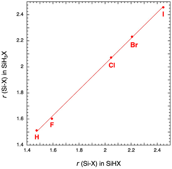 There is another way to check the accuracy of the results by plotting the r(Si-X) bond of SiHX molecules as a function of the r(Si-X) bond of SiH3X molecules [59]. As shown in Figure 1, a nice linear correlation is obtained.