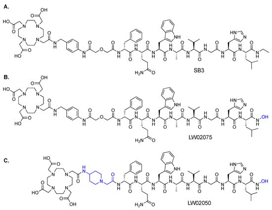 Inspired by the potent GRPR antagonist sequence, D-Phe-Gln-Trp-Ala-Val-Gly-His-Leu-NHOH, reported by Devin et al., we synthesized LW02075 (Figure 1B) by replacing the C-terminal ethylamide in SB3 (Figure 1A) with a C-terminal hydroxamate. The design of LW02050 (Figure 1C), replacing the pABzA-DIG linker in LW02075 with a more hydrophilic Pip linker, was based on data from our previously reported GRPR-targeted tracers, [68Ga]Ga-ProBOMB1 and [68Ga]Ga-ProBOMB2 [15,16]. Compared to [68Ga]Ga-ProBOMB1 containing a pABzA-DIG linker, [68Ga]Ga-ProBOMB2 containing a Pip linker showed a comparable high tumor uptake but a significantly lower uptake in normal organs/tissues, practically in the pancreas. Accordingly, in this study, we also used a Pip linker instead of the pABzA-DIG linker to synthesize LW02050 for comparison.
