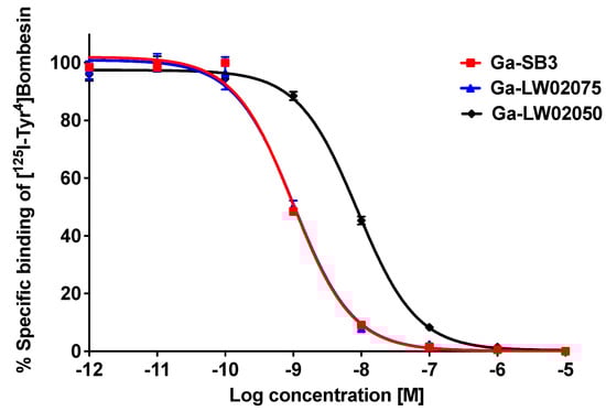 Displacement curves of [125I-Tyr4]Bombesin by Ga-LW02075, Ga-LW02050, and Ga-SB3 generated using GRPR-expressing PC-3 cells.
