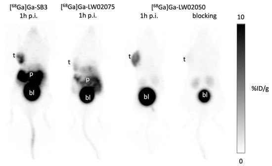 Representative PET images of [68Ga]Ga-SB3, [68Ga]Ga-LW02075, and [68Ga]Ga-LW02050 acquired at 1 h post injection in mice bearing PC-3 tumor xenografts. t: tumor; p: pancreas; bl: urinary bladder.