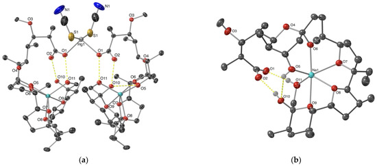 ORTEP diagram (50% probability level) of (a) complex 1 and (b) sodium monensinate core in 1. Protons are omitted for clarity. Colour code: C—dark grey, O—red, N—dark blue, S—yellow, Na—light blue, Hg—grey, H bonds—yellow dash.