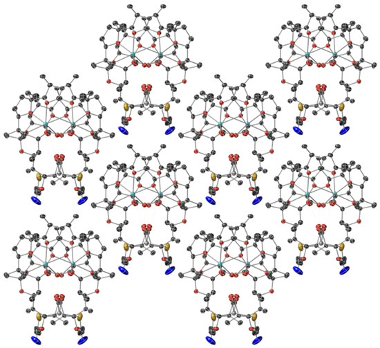 Sodium cations cannot be replaced by Hg(II) ions and remain accommodated into the hydrophilic space of monensinate ligands. The metal(I) centre is coordinated to four ether (O6, O7, O8, O9) and two hydroxyl (O5, O10) donor atoms in a highly distorted octahedral geometry (Table 1, Figure 2b). Na-O bonds range within 2.33–2.46 Å; the observed distances are in close agreement with previously reported data on sodium monensinate [42,43] and its heteronuclear complexes that contain Co(II) or Mn(II) cations and chloride co-ligands [44]. The carboxylate and hydroxyl ends of monensinate are interconnected with each other by O11-H ··· O1 (2.700 Å) and O10-H ··· O2 (2.631 Å) intramolecular hydrogen bonds; in addition, the antibiotic anions are stabilized by a third H-bond O5-H ··· O10 (2.921 Å). Neither additional and obvious intermolecular interactions such as H-bonds between the ligands, nor the inclusion of solvent molecules that may serve as bridge(s) for H-bonds are observed in the crystal packing of complex 1 (Figure 3).
