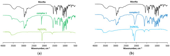 The IR spectrum of MonNa (Figure 4a,b) consists of two bands at 1560 cm−1 and 1408 cm−1 (Δ = 152 cm−1) attributed respectively to the νCOOasym and νCOOsym of the carboxylate function that is not involved in direct interaction with sodium cations. The stretching vibrations of the hydroxyl groups of the antibiotic appear as a broad signal in the range of 3550−3300 cm−1, accompanied by a low-intensity band at 1640 cm−1 assigned to δOH [45,46,47,48]. The parent mercury(II) salt exists in a pure thiocyanate form, as evidenced by its strong absorption band assigned to the C≡N bond (2100 cm−1), complemented by a weak C-S stretch appearing at 718 cm−1 (Figure 4a). In Zn(SCN)2, most of the zinc(II) ions are involved in the formation of metal-nitrogen bonds, apparent from the intense broad band at 2092 cm−1 (νCN) and the weak absorption at 893 cm−1 (νCS), while the rest exist in a bridge-like M-SCN-M structure with characteristic stretches at 2156 cm−1 and 784 cm−1, related to νCN and νCS, respectively [49,50,51] (Figure 4b).