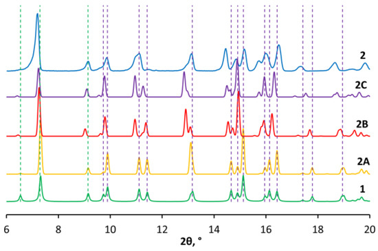 Powder XRD of complex 1, modelled species 2A–C and complex 2 within 6–20°.