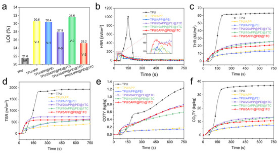 (a) LOI and UL-94 testing results, (b) HRR, (c) THR, (d) TSR, (e) COTY, and (f) CO2TY of TPU and its composites.