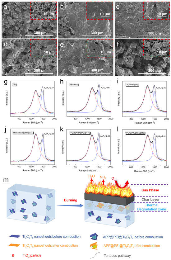 (a–f) SEM images of the char residues after the CCT test; (g–l) Raman spectra of carbon residues of TPU and its composites; (m) schematic representation for the flame-retardant mechanism of TPU/APP@PEI@Ti3C2Tx composite.