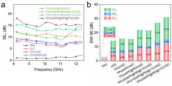 The SET, SEA, and SER calculation results of all TPU samples and the rGO film are shown in Figure 4. Figure 4a shows the total shielding efficiency (SET) as a function of the X-band (8.2–12.4 GHz) frequency of the multilayer hierarchical TPU/APP@PEI@Ti3C2Tx/rGO composite. It can be seen that the SET value of pure TPU is close to zero, while the SET value of the rGO film is 7.18 dB. Compared with pure TPU and rGO films, the SET value of multilayer TPU/rGO composites is 7.92 dB, slightly exceeding the rGO film. This suggests that the presence of the rGO film causes TPU composites with a multilayer structure to absorb a portion of the electromagnetic waves that penetrate through its interior. Moreover, the higher SET value of TPU/APP@PEI, compared to TPU/APP, is primarily due to the conductive network established by APP and PEI through electrostatic interaction-driven self-assembly. This network further enhances the SET of the multilayer TPU composite structure [44]. Notable is the increase in the SET value of hierarchical TPU/APP@PEI@Ti3C2Tx/rGO composites with a multilayer structure upon the addition of Ti3C2Tx. Additionally, the SET value of TPU composites rises in tandem with the increase in Ti3C2Tx loading. This is attributed to the conductive network formed by Ti3C2Tx nanosheets in the composite and the large hydrogen bonding with APP and PEI, which will also enhance the electromagnetic shielding efficiency of the composite. Moreover, it is easy to observe from Figure 4b that there are dominant SEA and subordinate SER in the SET value of all samples, which means that the absorption effect plays a key role in attenuating electromagnetic waves. The above results demonstrate that hierarchical TPU/APP@PEI@Ti3C2Tx/rGO composite with multilayer structure has good electromagnetic shielding performance.