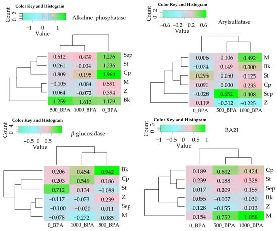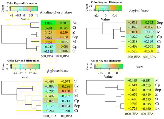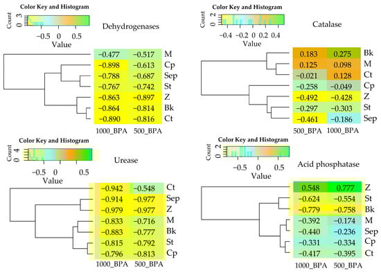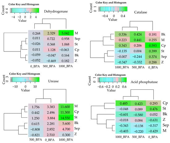 To diagnose the condition of soil subjected to BPA pressure, the activity of seven soil enzymes was determined: dehydrogenases (Deh) [88] and catalase (Cat) [89], urease (Ure), acid phosphatase (AcP), alkaline phosphatase (AlP), β-glucosidase (Glu), and arylsulfatase (Aryl) [90]. The selection of these soil enzymes was dictated by the aim of obtaining holistic data on the extent of disruption of the biochemical transformations of carbon (Deh, Cat, Glu), nitrogen (Ure), phosphorus (AcP, AlP), and sulfur (Aryl), in which individual enzymes are involved. The significant parameters of individual biochemical analyses were as follows: