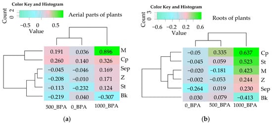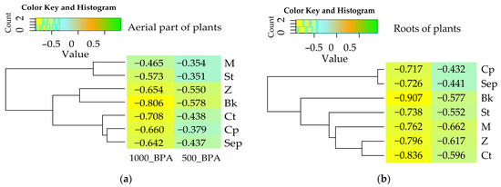 Given that soil condition defines its productivity, the response of Zea mays to BPA was monitored (Table 2). Considering the changes in the biomass of aerial parts and roots of the plants, a much stronger negative effect of higher doses of the xenobiotic on the growth and development of the cultivated plant was observed. The greater toxicity of BPA to its roots was also proven. The application of 500 mg BPA kg−1 soil resulted in a 60% inhibition of root yield, while the yield of aerial parts was reduced by 44% compared to the control. Conversely, in the group of objects subjected to the pressure of 1000 mg BPA kg−1 soil, the trend observed was a reduction in the yield of aerial parts of Zea mays similar to the yield of its roots. It oscillated at levels of 71% and 84%, respectively.