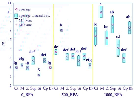 The ratio of the mass of the aerial parts of plants to the roots (PR) in the soil contaminated with BPA. The abbreviations are explained in Figure 1. Homogeneous groups were determined for the PR ratio assigned to all objects sown with Zea mays (represented by letters a–g), significant at p = 0.05, n = 63.