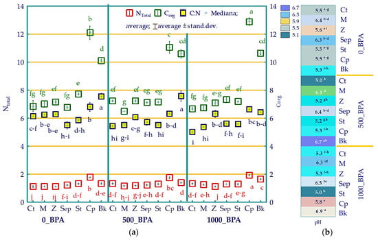 The phenolic compound introduced into the soil slightly moderated the nitrogen and organic carbon content, thereby affecting the soil C:N ratio (Figure 6a). The application of 500 mg BPA resulted in a 19% increase in nitrogen and a 5% increase in carbon ultimately leading to a decrease in the C:N value. Among the six remediating substances applied, Cp was responsible for a spectacular increase in soil organic carbon. It was twice as high in objects with soil exposed to 1000 mg BPA kg−1 of soil and in objects not contaminated with this xenobiotic compared to the control soil. Pre-fermented bark (Bk) was the second most effective in maintaining the trend described. Therefore, after its supplementation into the soil, the highest C:N ratio values were recorded in two sets of objects: Bk_0 = 7.561 and Bk_500 = 7.573, indicating a 23% increase in this parameter in each of them compared to the control. Regardless of the scale of soil contamination with BPA, molecular sieve and sepiolite induced an average increase in soil pH of one pH unit (Figure 6b). Pre-fermented bark also increased soil pH values, but only in objects with the combined effect of this remediation substance and the phenolic compound.