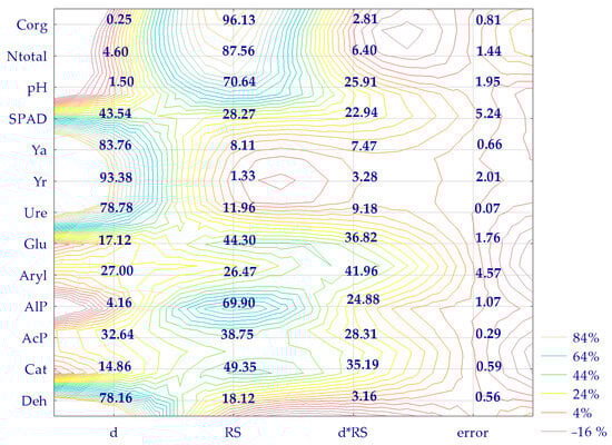 The share of independent variables (η2) in the change of soil enzyme activity, a yield of aerial parts and roots of Zea mays, SPAD, soil pH, total nitrogen, organic carbon, in %. d—dose of BPA kg−1 d.m. of soil, RS—remediation substance, Ya—aerial part of plants, Yr—roots of plants, Ntotal—total nitrogen, Corg—organic carbon, Deh—dehydrogenases, Cat—catalase, Ure—urease, AcP—acid phosphatase, AlP—alkaline phosphatase, Aryl -arylsulfatase, Glu—β-glucosidase.