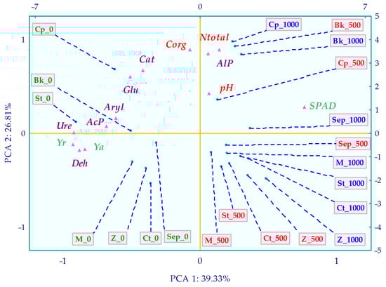 The association of thirteen research parameters allowed the delineation of the relationships between them (Figure 8). These were explored using multivariate PCA. The PCA highlighted the extent of BPA interference and the bioremediation potential of the applied remediation substances. 39.33% of the total data variance, explained by the first principal component variable, was related to five soil enzymes: Deh, Ure, AcP, Aryl, Glu, and the SPAD index. The second variable, describing 26.81% of the variable variance (PCA2), illustrated the response of the Cat enzyme and AlP, parameters characterizing the response of Zea mays: Ya, Yr, as well as changes in soil Ntotal, Corg, and pH. The distribution of all cases demonstrated that BPA in the soil had an inhibitory effect on the six enzymes mentioned above. Their displacement further highlighted the beneficial effect of the sorbents applied to the soil on the biomass of Zea mays aerial parts. It also indicates a positive correlation between AlP activity and soil Corg and Ntotal contents, while emphasizing the importance of soil pH in this context.