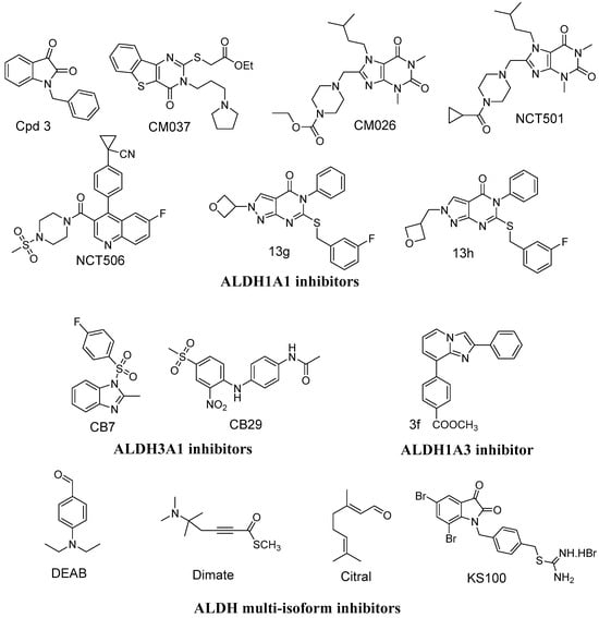 Since ALDH overexpression is known to promote cancer growth and therapeutic resistance, there has been an interest in developing efficient ALDH inhibitors. Current ALDH inhibitors can be divided into two groups: those that predominantly inhibit multiple isoforms and those that specifically inhibit a single isoform [26]. Examples of the isoform-specific inhibitors include the ALDH1A1 inhibitors Cpd 3, CM037, CM026, NCT-501, NCT-505, NCT-506, 13g and 13h; ALDH3A1-specific inhibitors CB7 and CB29 [26,27,28,29,30,31,32,33,34]; and ALDH1A3-specific inhibitor Cpd 3f [35,36,37] (Figure 1). Due to low potency, bioavailability, or overlapping functions with other isoforms, these drugs demonstrate little evidence of in vivo activity. However, some can be effective; for example, NCT-501 reduced HNSCC xenograft development by 78% when injected intratumorally [29]. Since cancer cells often contain many ALDH isoforms, targeting multiple isoforms may be necessary for the best anticancer therapy. N,N-Diethylamino benzaldehyde (DEAB), 4-dimethylamino-4-methyl-pent-2-ynthioic acid-S-methyl ester (DIMATE), citral, (Aldis)-1, 2, 3, 4 and 6, and dyclonine are examples of compounds that block multiple ALDH isoforms [26,38,39,40,41,42,43,44,45,46] (Figure 1). However, their effectiveness might depend on which ALDH isoforms are inhibited. This can also lead to unexpected effects; for example, DIMATE’s oral bioavailability is uncertain, and citral has off-target effects and can be toxic [38,40,41,42,43,47]. Although various drug-like compounds targeting ALDH have been reported in the literature, none have made it to routine use in the oncology clinic. As a result, new, potent, non-toxic, bioavailable, and therapeutically effective ALDH inhibitors are still needed.