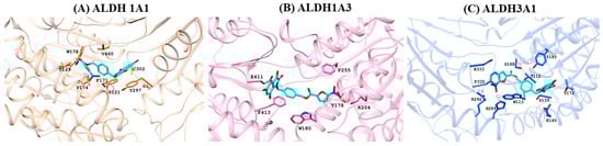 To model the binding interactions of compound 3 with ALDH1A1, ALDH1A3, and ALDH3A1 proteins, the Autodock Vina was used to perform molecular docking [57]. The structures ALDH1A1 (PDB: 4X4L), ALDH1A3 (PDB: 7QK7), and ALDH3A1 (PDB: 3SZB) were retrieved on 25 May 2023 from the protein data bank (PDB) (https://www.rcsb.org//). Protein three-dimensional structures were prepared by removing water molecules from the structure coordinates files, adding hydrogen atoms and charges using MGL tools, and then converting it to PDBQT format as per the defined methodology. Prepared protein structures were used to generate scoring grids for further docking calculations. A grid box of size (40 × 40 × 40 Å) was centered on the corresponding active site position with 0.375 Å grid spacing. The grid dimensions and exhaustiveness values for ALDH1A1, ALDH1A3, and ALDH3A1 are given in Table 5. The ligand was prepared by setting the active torsions and detecting the root of the molecules to adjust them according to the defined pocket of the target proteins. The docking studies were carried out with rigid proteins, and all docking parameters were set to a default value. The schematic diagrams of the protein–ligand interactions were generated and analyzed using UCSF-Chimera [58].