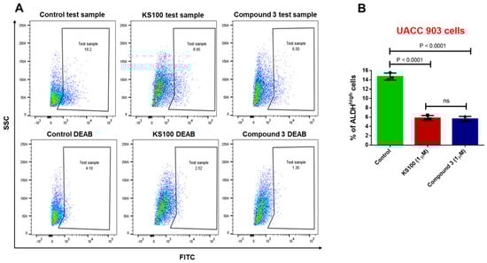 Aldehyde dehydrogenase (ALDH) activity within human melanoma cells was assessed by utilizing the ALDEFLUOR Kit from STEMCELL Technologies. UACC 903 cells underwent separate 24 h treatments with 1 µM KS100, 1 µM Compound 3, and DMSO served as a control. Post-treatment, cells were washed with PBS, and the ALDEFLUOR assay was performed following the manufacturer’s protocol, employing DEAB as a negative control. ALDH percentages were determined using a BD LSRFortessa flow cytometer (San Jose, CA, USA).