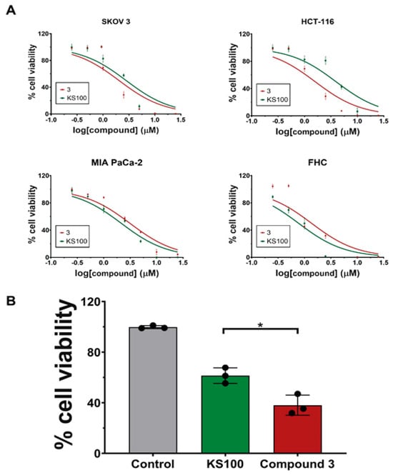 (A) HCT-116, SKOV-3, MIA PaCa-2, HEK-293, and FHC cell lines were treated with compound 3 (KS124) and KS100 for 48 h at different concentrations. At the end of the treatment duration, an MTS assay was performed. The data were analyzed on GraphPad V 8.0 software (Prism, CA, USA) using non-linear regression. (B) Trypan blue dye exclusion assay–HCT-116 cells were treated with 3 µM of compounds 3 (KS124) and KS100 for 48 h. The cells were harvested and stained with trypan blue. The live cells (excluded trypan blue) and dead cells (stained with trypan blue) were counted using a hemocytometer. Data are presented as mean ± SD; n = 3 for each treatment with * p < 0.05.