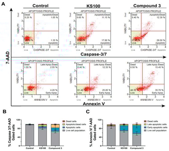 (A) HCT-116 cells were treated with compound 3 (KS124) and KS100 24 h (Caspase 3/7 assay) and 48 h (Annexin V/7-AAD assay). (B,C) represent the quantification of the apoptotic cell population after the Caspase 3/7 assay and Annexin V/7-AAD assay, respectively. Data are presented as Mean ± SEM; n = 3 for each treatment.