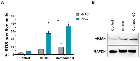 (A) The generation of ROS in HCT-116 cells was assessed by using the Muse oxidative stress kit. Untreated HCT-116 cells were taken as the control, and cells were treated in the presence or absence of the antioxidant NAC (10 mM). HCT-116 cells were treated with 3 µM of compound 3 (KS124) and KS100 for 24 h. Data are presented as mean ± SD; n = 3 for each treatment at each time point. * p < 0.05 compared to KS100 treated cells. (B) Western blot demonstrating increased γH2AX protein levels in HCT-116 cell lines treated with 3 µM of compound 3 and KS100 for 12 h.