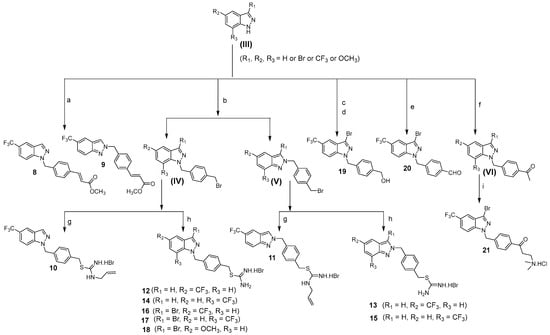 Synthesis of novel indazole derivatives (8–21). Reagents and conditions: (a) NaH, DMF, 60 °C, methyl (2E)-3-[4-(bromomethyl)phenyl]-2-propenoate; (b) NaH, DMF, 60 °C, 1,4-bis(bromomethyl)benzene, RT; (c) NaH, DMF, 60 °C, 4-(bromomethyl)benzyl)oxy)TBDMS; (d) THF, TBAF, RT; (e) NaH, DMF, 60 °C, 4-(bromomethyl)benzaldehyde; (f) NaH, DMF, 60 °C,1-(4 (Bromomethyl)phenyl)ethanone; (g) N-allylthiourea, EtOH, reflux; (h) thiourea, EtOH, reflux; (i) Paraformaldehyde, dimethyl amine, EtOH, RT.