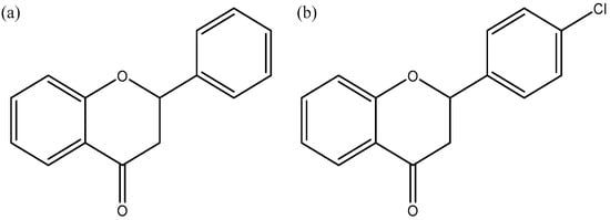 Flavanones are compounds of the group of flavonoids. Their spatial structure is based on a 4-chromanone ring. Naturally occurring flavanones are, among others, naringenin or hesperetin. Flavanones naturally occur as secondary metabolites produced by plants. Their main source is citrus fruits, for example, grapefruit and oranges. These compounds have antioxidant, anti-inflammatory, anticancer, and cardioprotective properties. Studies show that they can regulate the concentration of the LDL cholesterol fraction in the body [22]. Two compounds were selected for the study: the basic unsubstituted flavanone molecule and its derivative, chlorine substituted in the 4′ position (Figure 1). The selected compounds show potential use in medicine. 4′-chloroflavanone inhibits the proliferation of breast cancer cells of both MCF-7 and MDA-MB231 lines and has a toxic effect against many human tumor cell lines: MCF-7, MDA-MB231, as well as LNCaP and PC3 (prostate cancer cell lines) and also HepG2 (liver cancer cell line), SK-N-MC (neuroblastoma cell line), K-562 (leukemia cell line), and KB (nasopharyngeal epidermal cancer cell line) [23,24].
