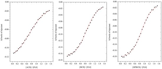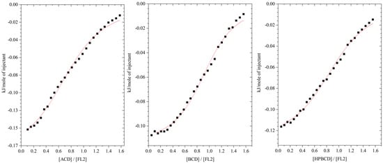For the mathematical description of the thermograms, the model of one active site was used. Based on this model, the stoichiometry of the inclusion complex (n), the formation constant of the flavanone (FL)-cyclodextrin complex (K), the molar enthalpy (ΔH), and the entropy (ΔS) of the complexation process were determined.