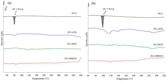 Thermograms of pure flavanones and their complexes: (a) flavanone (FL0); (b) 4′-chloroflavanone (FL2) (thermograms of pure cyclodextrins in Supplementary Materials).