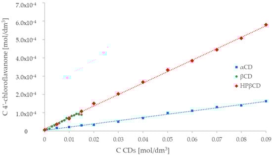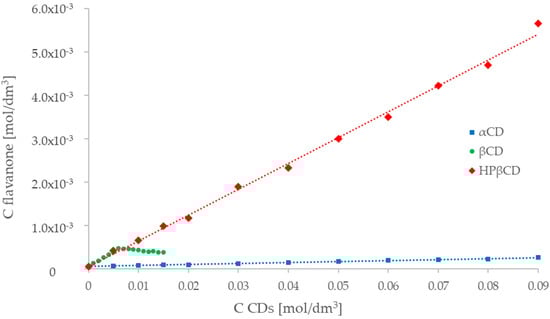 For all cyclodextrins, a linear increase in the solubility of flavanone (FL0) can be observed, and the solubility diagrams indicate the type of AL curve, which indicates the formation of complexes with a stoichiometric ratio of 1:1 like naringin [37].
